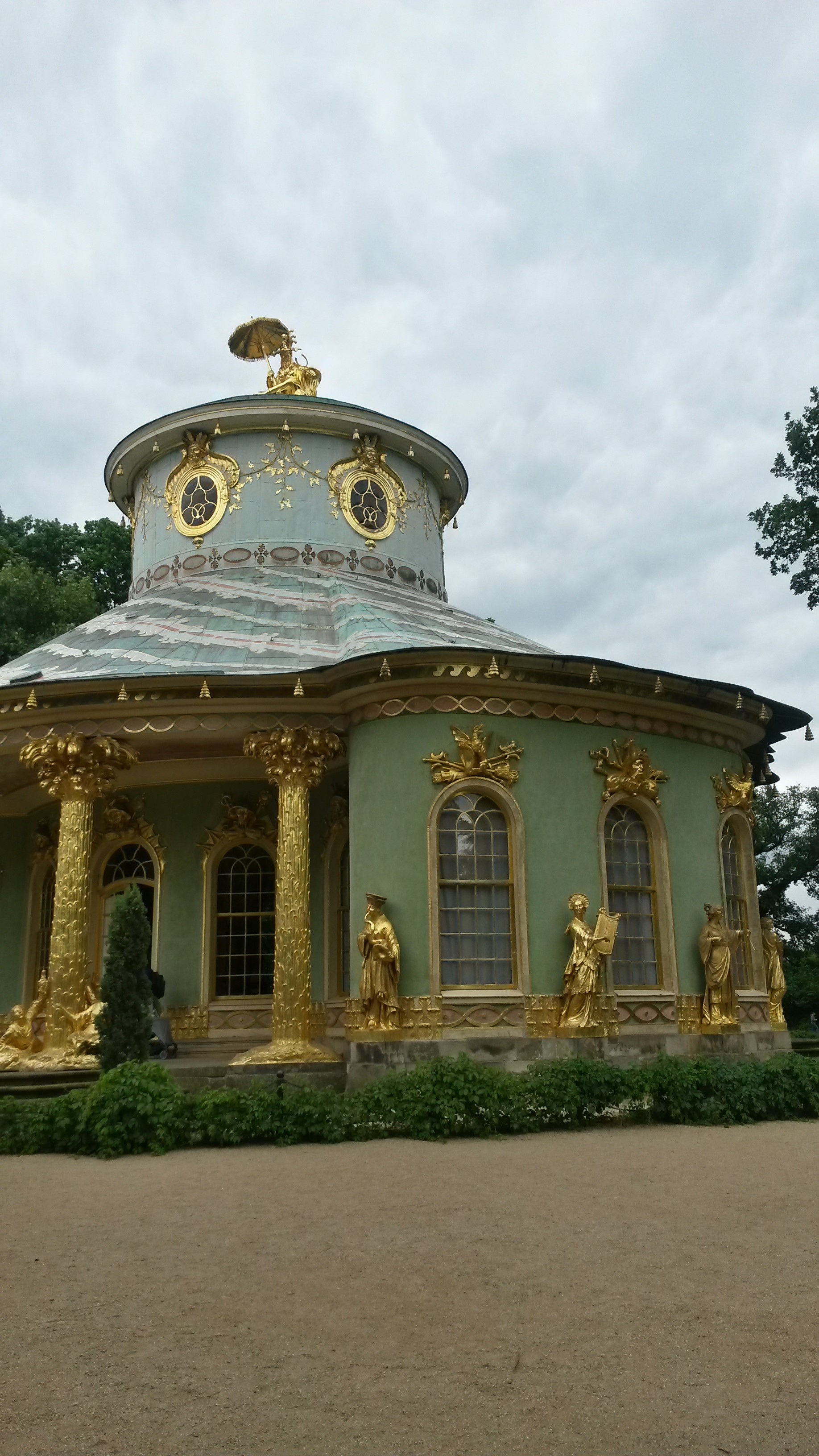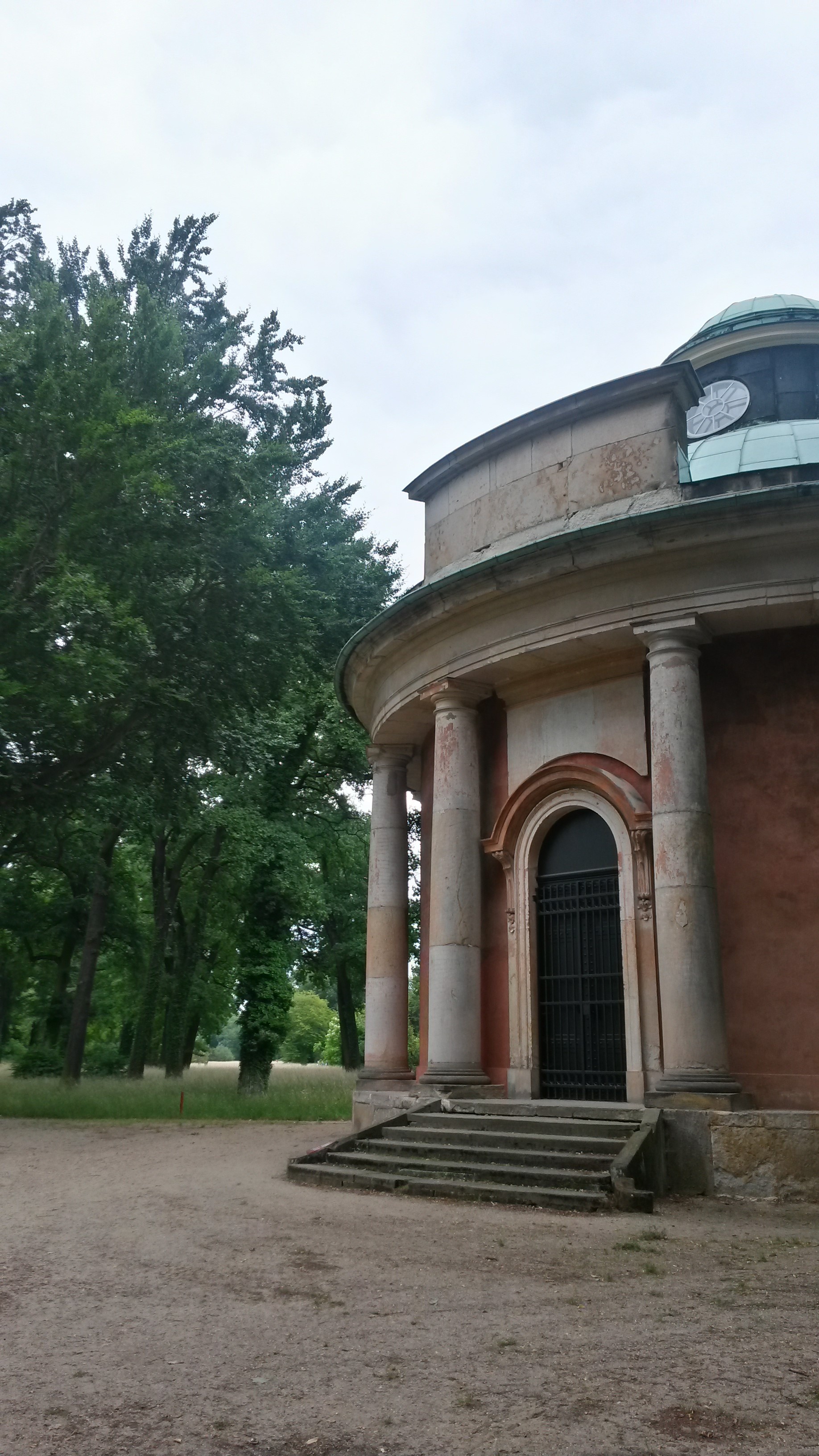 We took the regional train from Alexanderplatz directly to the station Park Sanssouci which is located only a 10 minute walk from the west entrance to the park where the Neue Palais is situated. The Neue Palais was built in 1763 after the completion of Sanssouci and was constructed in a much grander Baroque style than the smaller summer palace of Sanssouci built in Rococo style in 1745 and modelled after the palace of Versailles. Frederick the Great had the Neue Palais constructed later to house guests but he never lived there himself, preferring to reside in Sanssouci which is the French for ‘without worries’ and was his place to relax in summer away from the bustle of the Berlin court. After observing the Neue Palais and ignoring the dark clouds above us, we continued our walk into the park past the Botanical Gardens and finally stopped in the shade of a large maple tree as one of the large clouds above us broke into a shower. When the shower stopped we continued our rambles which led us to The Temple of Antiquity which Frederick the Great had constructed to house his valuable collection of ancient art. In the 19th century the temple was converted into a mausoleum.