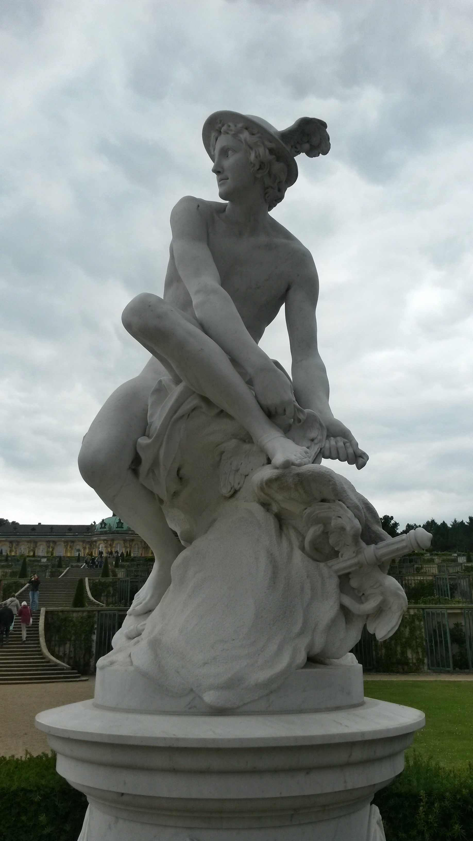 After admiring the marble statues of Mercury, Venus, Minerva, Apollo and a host of other Greek and Roman Gods and Goddesses we ascended the steps to the palace and then bore right to where Frederick the Great is buried next to his dogs that he adored so much. Frederick’s grave is decorated with potato figures and flowers: he was the man who introduced the potato to Prussia. This made us hungry and so we continued walking and after exiting the park we found a reasonably priced restaurant that served us delicious new potatoes which we enjoyed with white asparagus and hollandaise sauce. I also ordered a salmon filet and my roommate a schnitzel. From our seats we had a view of Potsdam’s Brandenburg Gate.