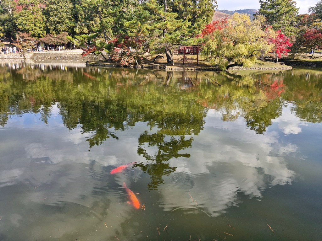 Dáire and I left Kyoto on Friday morning, November 14th. We checked out of our room and walked with our bags back to the station. It was a sunny morning and our next destination would be Nara for a few hours en route to our hotel in Osaka. There are two trains between Kyoto and Nara: the local and the express train. We just missed the express because we had to top up our IC cards.(Metro cards that are good on all trains in Japan) Google maps helpfully tells you approximately how much the train fare will be between cities, in this case the local was about 720 Yen (about 3.97 Euro) It took about 1 hour and 15 minutes, which was fine, after all, because we weren’t really in a massive hurry, plus we got seats because we got to the platform early. We also left after rush hour. One feature I especially noticed from our train rides in Japan were the many river beds that only had a small amount of water running through a much larger river area and under wide and tall bridges. In the rainy season – June and July, which also brings typhoons, these rivers really fill up. We were well advised to avoid going to Japan between June and August. First it is bucketing rain, followed by unbearable heat. We found November just lovely.