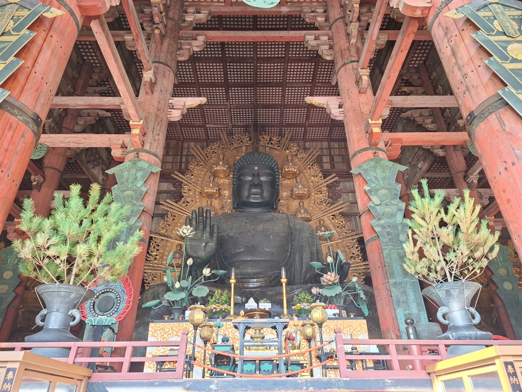 The deer were entertaining and they were all over the park, but the other incredible attraction in Nara besides these creatures is, of course, the unbelievable Toda-Ji Buddhist Temple. First you pass through a huge entrance gateway (with deer everywhere), then you walk past a beautiful pond with large orange koi swimming in it surrounded by perfectly landscaped gardens. From there you can pay a modest entrance fee into the temple which houses the world’s largest gilded bronze Buddha statue. The Buddha is seated on a platform and its height is 50 metres. We had just seen a lot of temples and shrines the previous week but this building blew our minds. It was the biggest one, by far, that we had seen. The site is a UNESCO World Heritage Site and it is no wonder. We have never seen anything like it.
