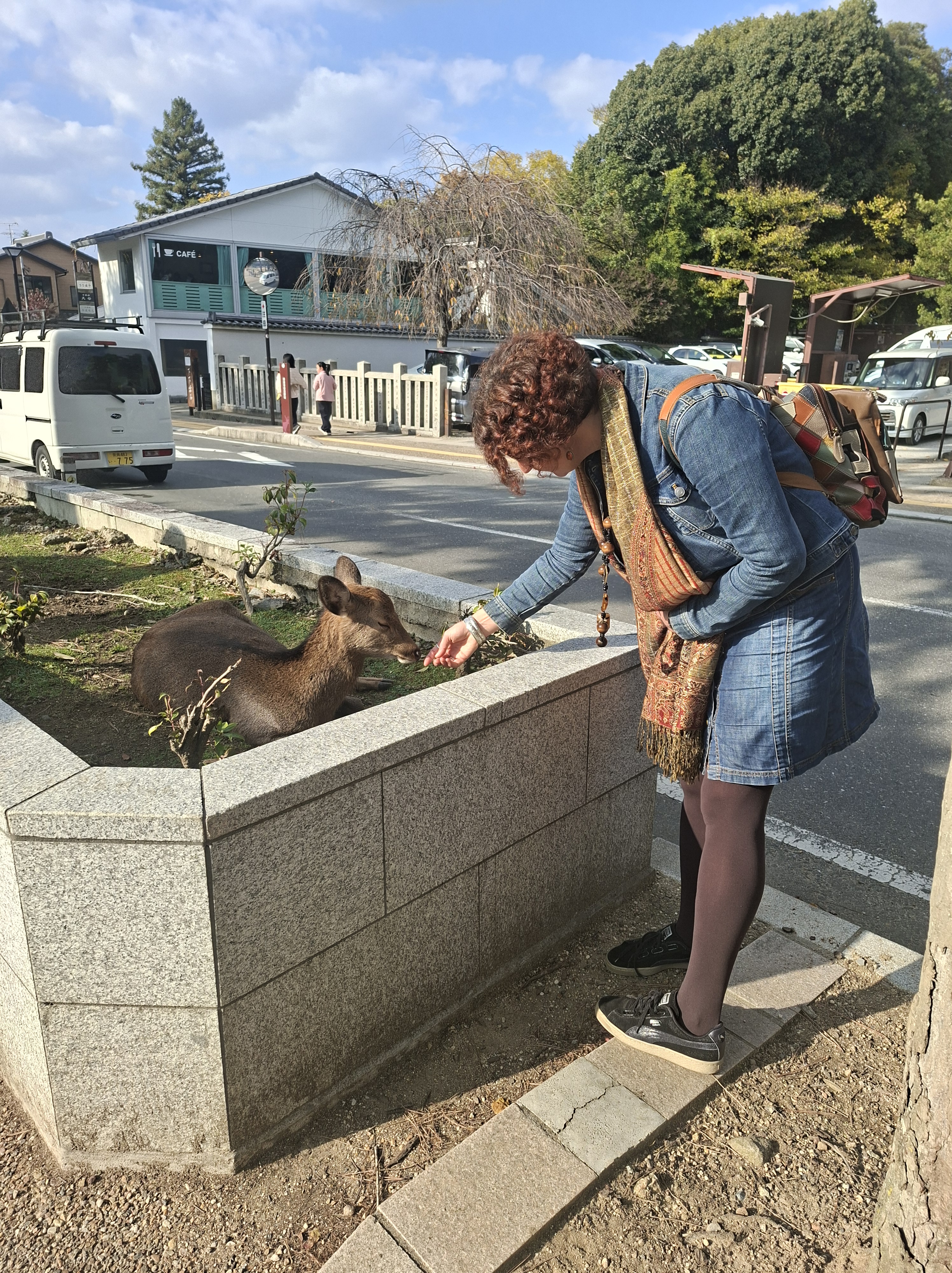 We arrived at Nara Station at about noon and looked for a locker for our bags. This took us about 20 minutes to do because the lockers upstairs were all full, but we found more downstairs in the station. One locker was quite big and fit both our wheelie bags (cabin sized) and both our backpacks. It cost 1,000 Yen (about 5.60 Euros). We then walked out of the station and there was a big sign saying Nara Park and a bus right next to it. This is why visitors come here: to see Nara Park and like most places in Japan, it was easy; there were attendants standing there, instructing you to stand in line and within 10 minutes we were on the bus to see one of the strangest things we have seen: bowing deer. Yes, that’s right. As soon as you arrive at Nara Park, there are deer everywhere: sitting at the side of the street, wandering around freely, sitting in raised flower beds resting. City authorities have clearly given up on trying to grow any plants in these raised, concrete flower beds; the deer use them as their beds. As soon as you walk up to the deer, they stand there in front of you, bowing at you and let you stroke them. We couldn’t help but be highly amused by this. In Japan, where people bow, the deer also bow! They especially bow to people who purchase the special deer crackers to feed them.