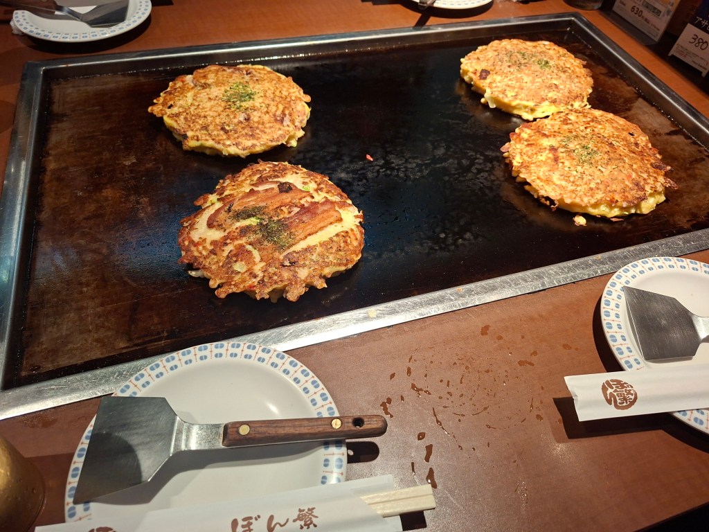 From there we cycled along the Yodo River. Our guide pointed out a building that had a large round feature on it that looked like a giant coin. The city mint, he informed us. The Japanese love cash and you can pay almost anywhere with cash and a lot of places only take cash. The smallest denomination is a One Yen coin which equals about half a penny. We arrived at a restaurant at exactly 12.30pm for our lunch reservation. I credit our guide for his excellent timing with this. He obviously knew exactly what he was doing. We went in and had a semi private room in the back of the restaurant; a large table with a large griddle in the middle and lots of delicious condiments. We were here to try an Osaka speciality; Okonomiyaki which is a delicious Japanese savoury pancake made of wheat flour, batter and other ingredients. Dáire ordered the one with pork and I ordered the one with cheese and we shared them. It also had cabbage and spices in it. It is brought to you cooked and kept hot on the griddle while you pile it up with aonori (seaweed flakes) bonito flakes, okonomiyaki sauce (which is basically Worcestershire sauce) and a good squeeze of Japanese mayonnaise. We were hungry after all the cycling that morning, so we really enjoyed this.