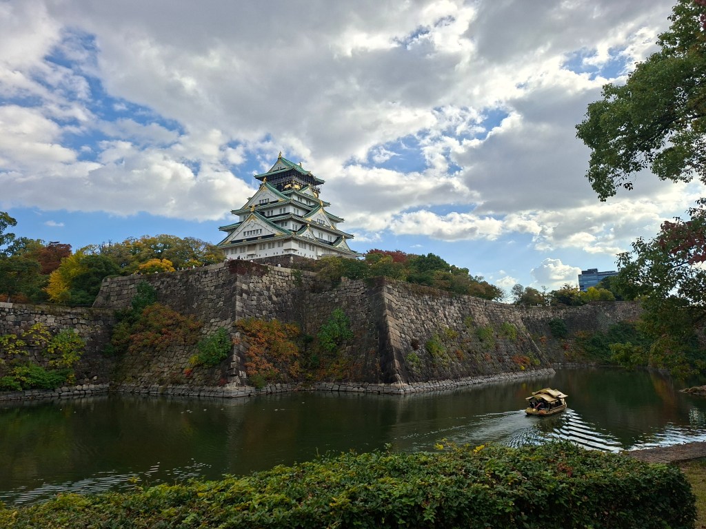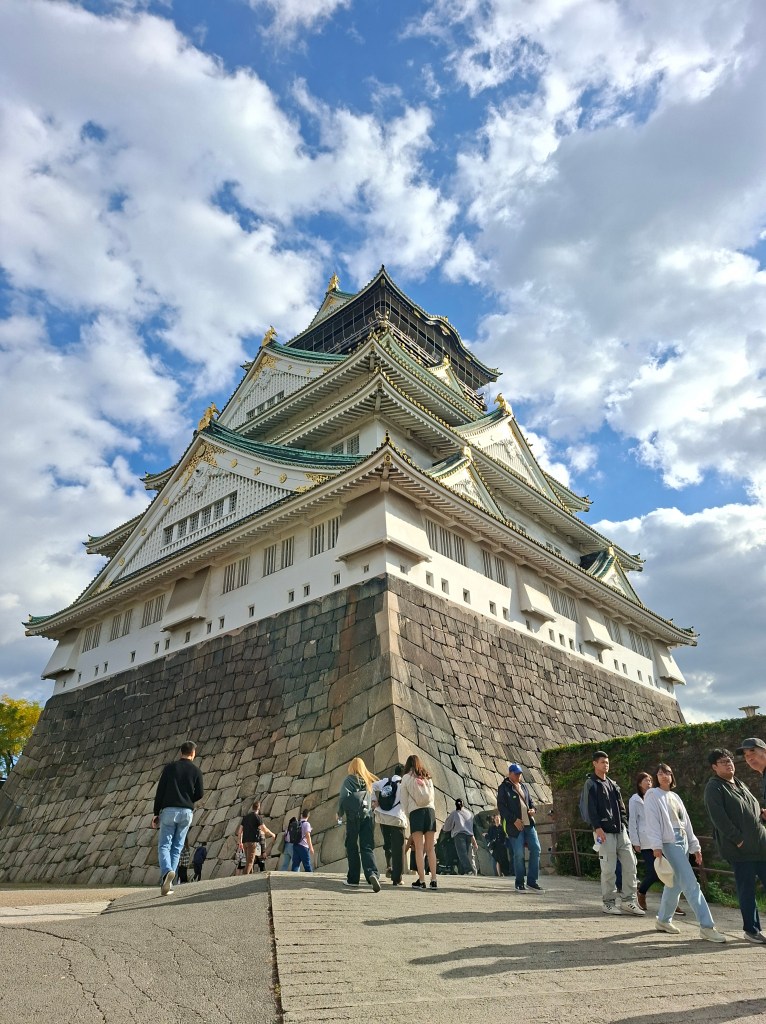 After lunch we got back on our bikes and cycled another 15 minutes to the next stop on our tour: Osaka Castle. We parked our bikes and walked up and around the castle grounds which were stunning. It was Saturday afternoon so there was a long line to get into the castle. Our guide told us there is really no point trying to get in on a weekend when it is packed with visitors, this is why he opts for the Museum of Housing and Living instead. In any case, it was a lovely day so we were happy to stay outside. He took us to a great spot to take a photo of the castle with a pond and maple trees. Others were also waiting in line to get this picturesque shot. I found Osaka Castle to be quite a stunning piece of architecture. It is one of Japan’s most famous landmarks and was built in 1583 by Toyatomi Hideyoshi who unified Japan. The castle you see today is a 1931 reconstruction and it sits on a formidable stone base.