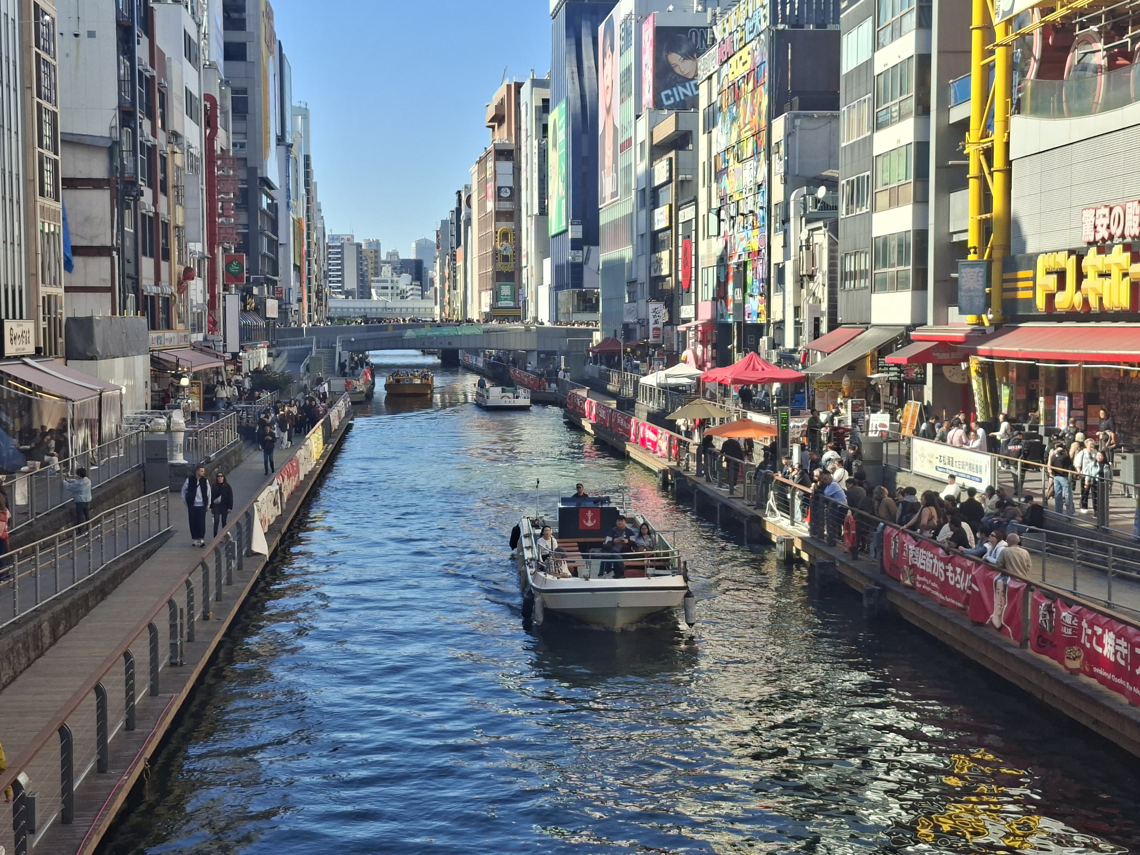 From there we walked back to Tennoji Station and back to our hotel room for hot showers and another pair of clean, fresh pajamas. This was our last night and we were very satisfied with how the trip had gone. After a good night’s sleep we checked out at 10am, stored our bags at reception and headed to Osaka’s famous Dotonbori district. Our flight wasn’t until 10.30pm that night so we still had time to do some exploring and have another meal. It was yet another beautiful day. Dotonbori has wooden boardwalks along the edge of a canal and is lined with restaurants and shops. We bought some matcha tea, matcha chocolate and sweets to bring home and also sat right at the canal in the sun and ate one last bowl of ramen and some gyoza.