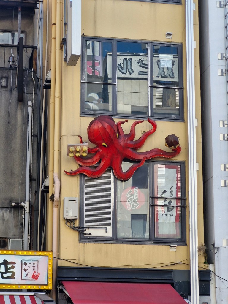After tea we cycled back to Temmabashi Station, put our bikes back in the garage and walked the 5 minutes back to our hotel to relax for a while. We were tired but this was our last night in Japan so we had showers and went out again to an area that had been recommended by our guide: Osaka’s Shinsekai District and the Tsutenkaku Tower which was originally built in 1912 and modelled after the Eiffel Tower. The current tower was rebuilt in 1956 after World War 2 damage. It also has a slide from the 3rd floor down for people seeking an adrenaline rush. We took the train back to Tennoji Station and walked through Tennoji Park. It was dark and we could see the brightly lit tower in the distance. Before long we were in a bustling street with tonnes of neon lights and vendors selling all kinds of fried foods. A speciality of Osaka are fried octopus balls known as takoyaki. Vendors have hot skillets that have little round holes in them which they pour batter into and then add a bit of octopus into the middle of each ball. We decided not to eat these because they looked really greasy and we like octopus alive and not cooked because they are highly intelligent and lovely creatures. We saw a sign in Osaka that made us laugh. It was an octopus holding out a tray of fried octopus balls. Basically saying: ‘Eat me!’ Um, no thanks. Still, it was a kick to experience the atmosphere of this area on a Saturday night.