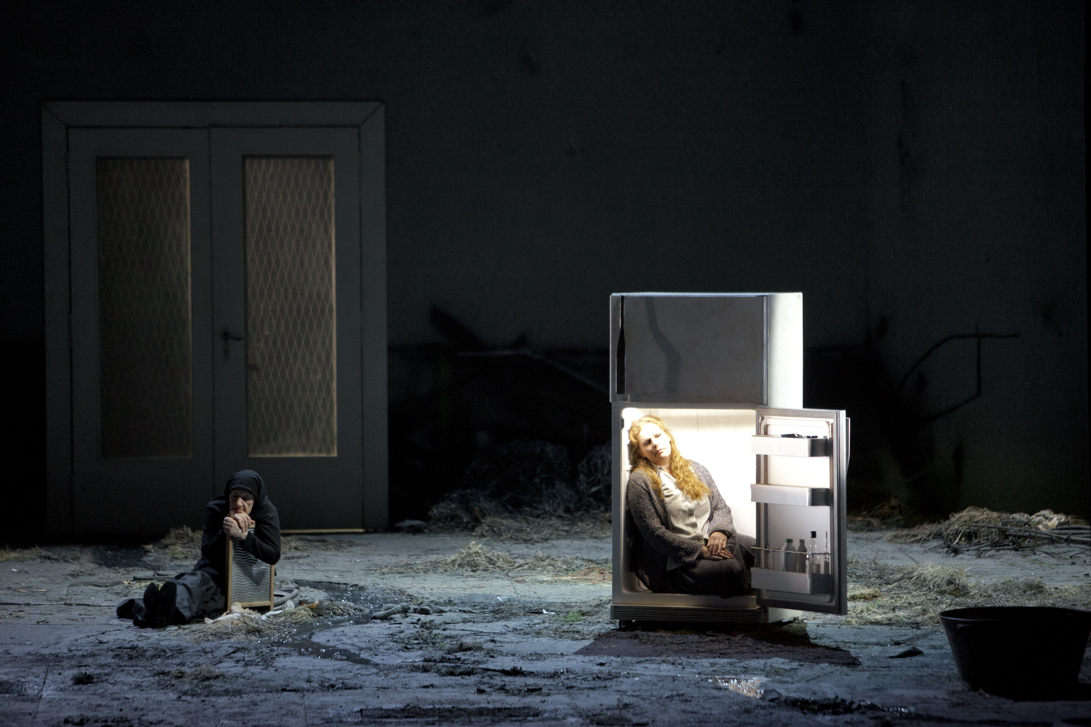 And while Janacek set the original story on the banks of the River Volga in the 1860’s, German stage dierector Andrea Breth sets this story in modern times and the opening scene shows Katya in a fridge next to an empty bottle of vodka. In the first act the fridge door is closed in her face locking her inside. This is not exactly a subtle metaphor for being locked up and treated coldly by those around her. And the bottle of vodka? It is not drunk by Katya but by Dikoj the drunk and maudlin merchant, sung by bass Pavlo Hunka. One scene depicts him and Kabanicha on the table engaging in a ridiculous looking sex act, him drunk and her putting her hands down his pants. All the time she is dressed in a beautiful purple dress, the fanciest in the whole set of costumes, which in some ways is supposed to show her decorum. But it is a false decorum, clearly. She is just as weak as the next person, but tries to hide her human weaknesses behind her social standing and powerful position in the community. Kabanicha and Dikoj feel that they are immune to sin by doing the right things in society such as paying alms and duties. They will never suffer the pain of great love as Katya does, as they are incapable of loving and caring as deeply as she does.